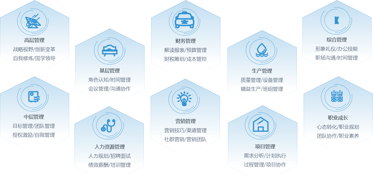 不同级别的员工发展方向各不相同且各有侧重,沛邦学院的企业内训从个人能力提升、岗位管理能力提升、管理技能提升、战略能力提升、格局视野提升五个层面,精选国内外高端课程资源(100门课程涵盖10大岗位领域),力求满足不同发展阶段的能力提升需求,帮助企业解决工作中的实际挑战。
